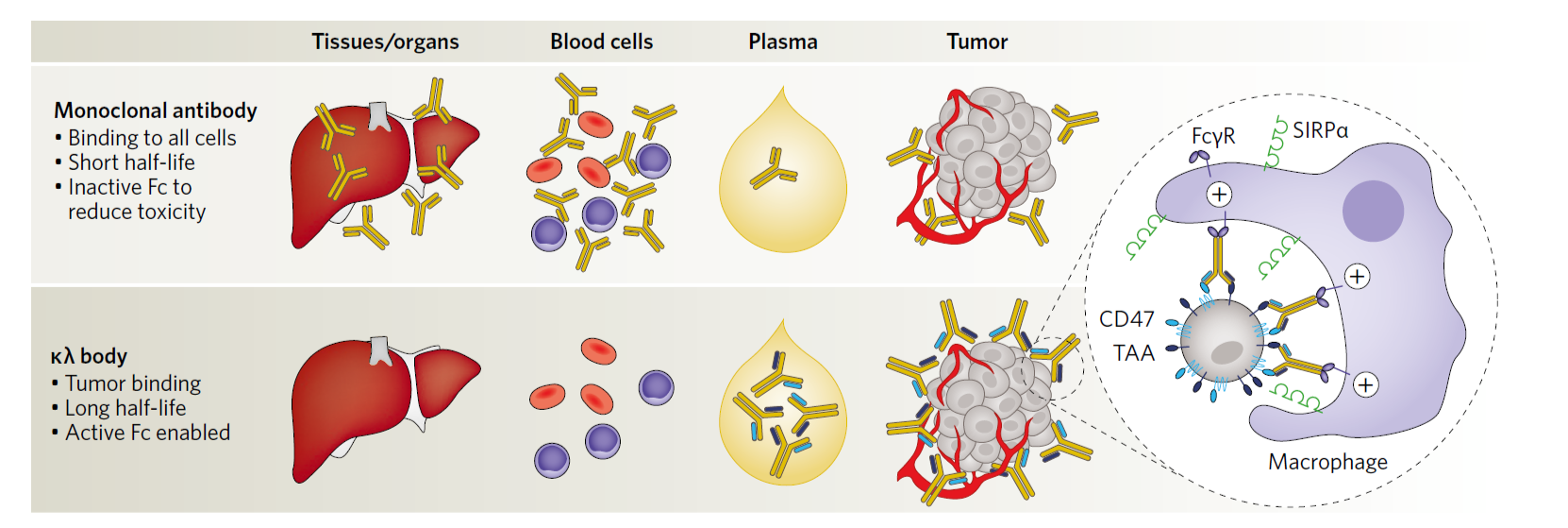 Tumor cells frequently hijack this system and overexpress CD47, which translates clinically into worse prognoses across several cancer indications. Blocking the signalling between CD47 and SIRPα with anti-CD47 mAbs increases the phagocytosis and killing of tumor cells. However, early examples of this approach contained a fully functional Fc portion that led to indiscriminate binding and killing of normal cells, including red blood cells (RBCs) and platelets,which resulted in dangerous thrombocytopenia.