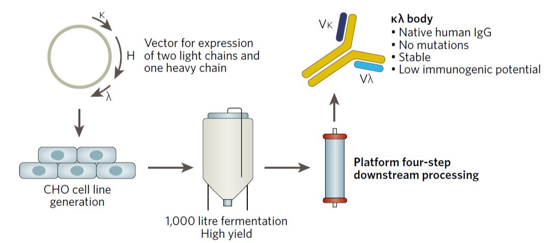 Fig. 1 | κλ body production process. Simple co-expression and assembly of two light chains and one heavy chain in stably transfected Chinese Hamster ovary (CHO) cells, followed by a downstream purification process applicable to any κλ body. The final product is a bispecific antibody fully retaining the native structure of a human IgG.