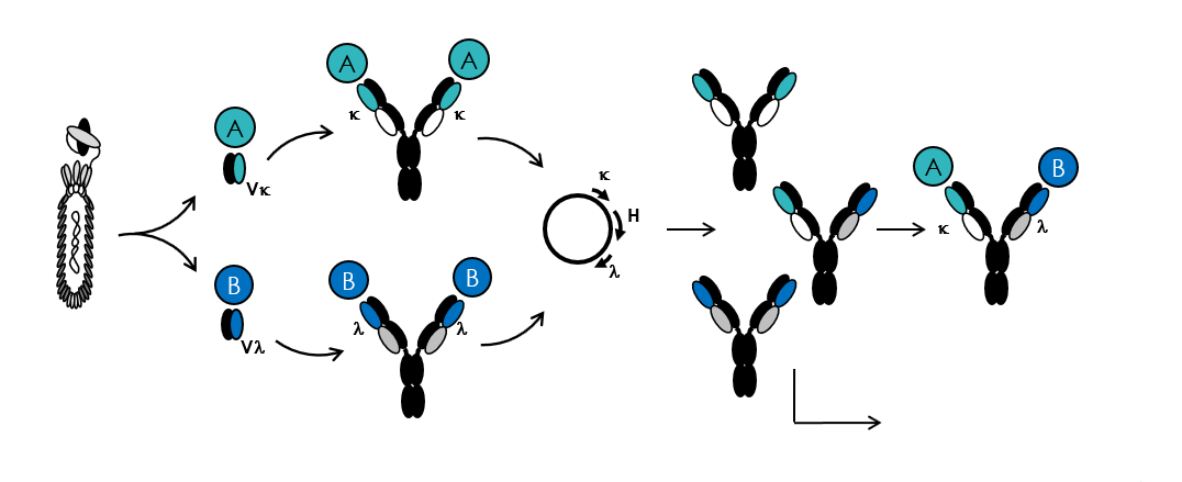 We first identify antibodies using our common heavy chain antibody libraries. Then, we simply co-express one heavy chain and the two light chains. The bispecific κλ bodies can be directly tested using the cell culture supernatant or easily purified using standard affinity chromatography.